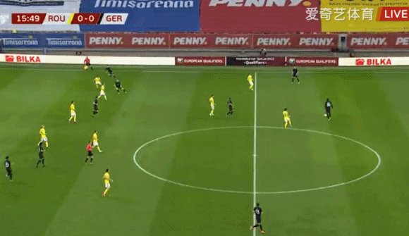 19'罗马尼亚解围不远,基米希外围远射折射后击中横梁,萨内补射也被化解